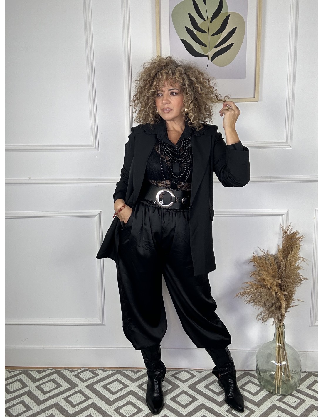 El interior está forrado en un tono beige satinado, asegurando un ajuste cómodo y pulido. En conjunto, es una prenda versátil, sofisticada y fácil de combinar, perfecta para crear tanto conjuntos formales como estilos más casuales con un toque chic.