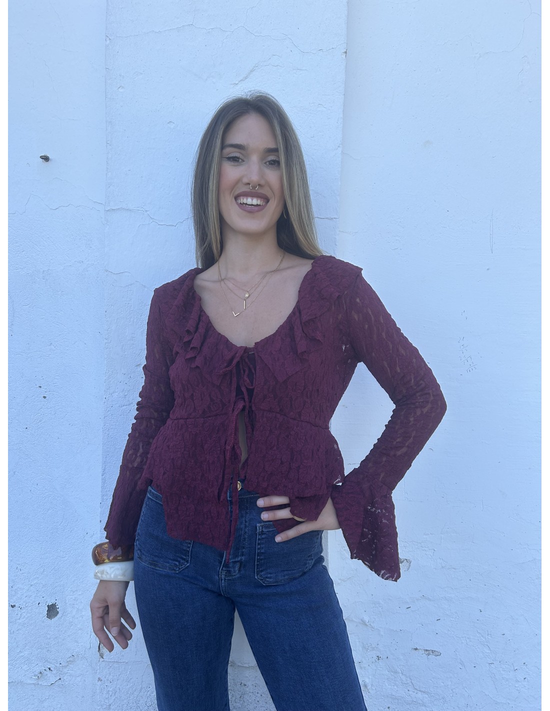 Es una blusa de encaje beige claro con diseño floral semitransparente. Tiene mangas largas que terminan en un volante acampanado, un escote en forma de V con solapas anchas y dos lazos en la parte frontal para ajustar. El corte es entallado en la cintura y cuenta con un volante en la parte inferior.