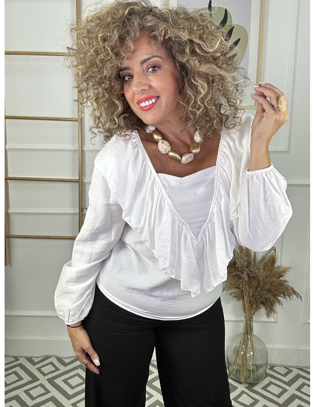 Blusa confeccionada en tela ligera. Tiene un escote en forma de “V” decorado con un volante amplio que continúa hacia los hombros, aportando un estilo romántico y femenino. De corte suelto, brinda comodidad y movimiento, ideal para un look casual con un toque elegante.