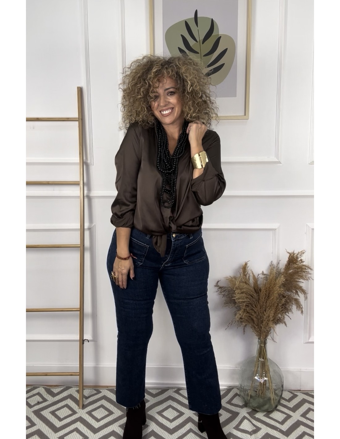 Esta es una camisa clásica de corte desigual mas larga por detrás con un diseño elegante y versátil. Está confeccionada en una tela lisa satinada, lo que le da un ligero brillo.
