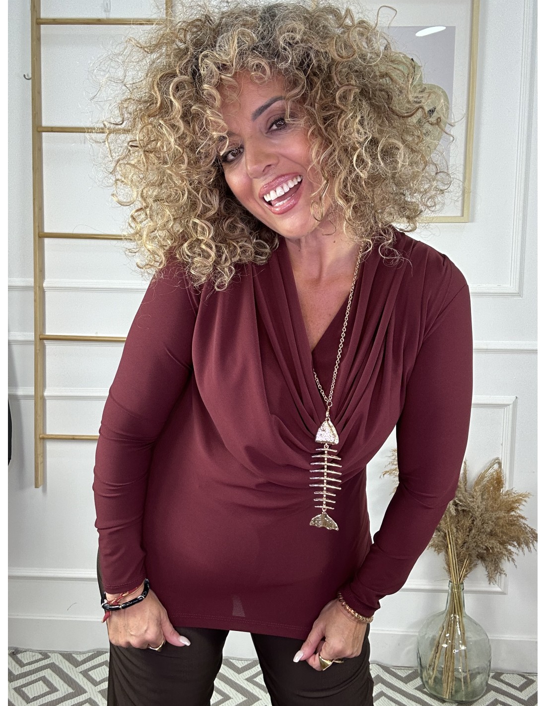La blusa que aparece en la imagen. Tiene un diseño elegante con escote drapeado (caída en pliegues suaves en la parte delantera), lo que le da un estilo fluido y sofisticado. Está confeccionada en una tela ligera, probablemente poliéster o una mezcla similar, ideal para ocasiones tanto formales como casuales dependiendo de cómo se combine.