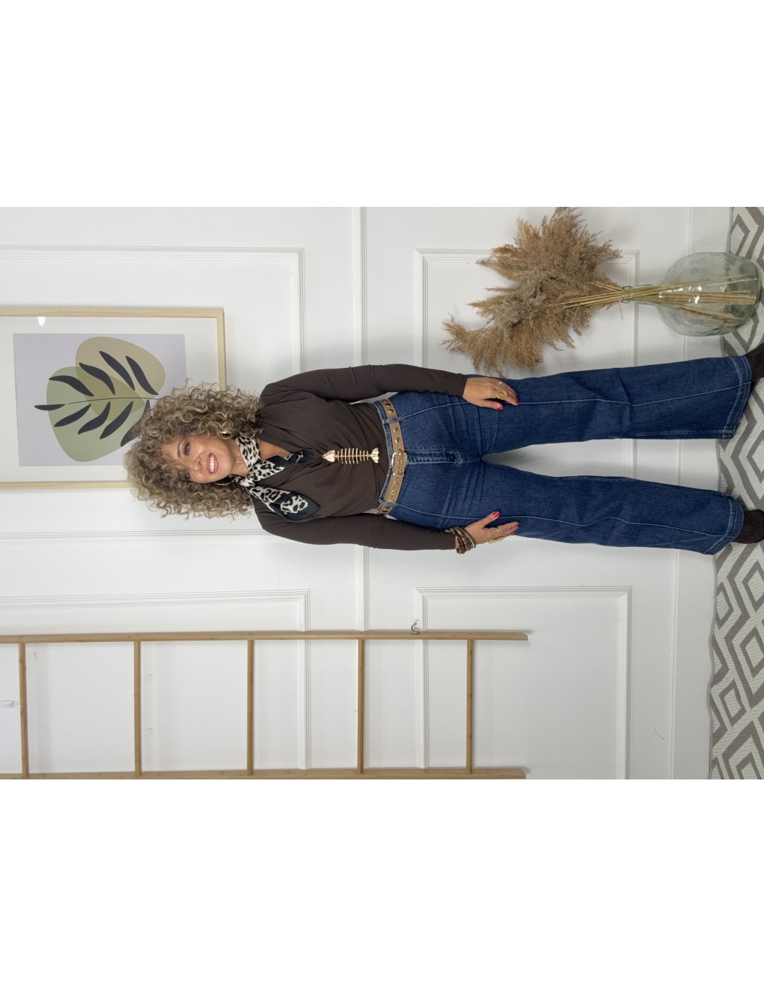 Además, sobre la blusa se muestra un collar dorado con dije en forma de espina de pez estilizada, que añade un toque llamativo y moderno al conjunto.
