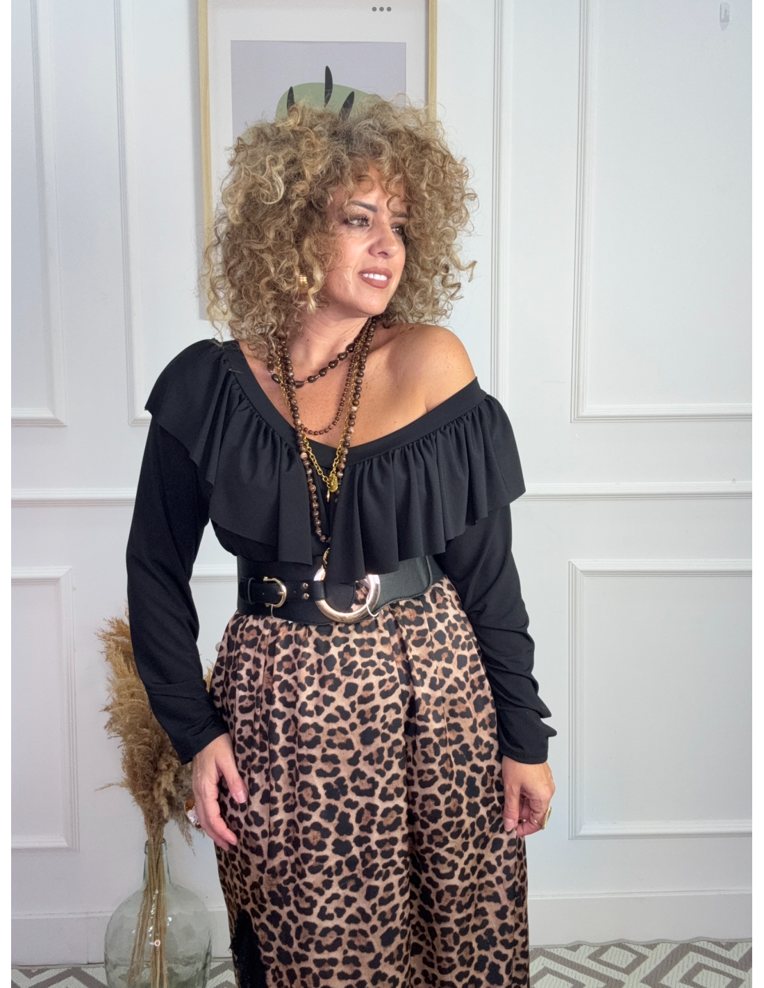 Este body de manga larga tiene un diseño elegante y femenino. Cuenta con un escote amplio en forma de barco adornado con un volante ancho que recorre todo el contorno del escote, aportando un estilo romántico y con movimiento.