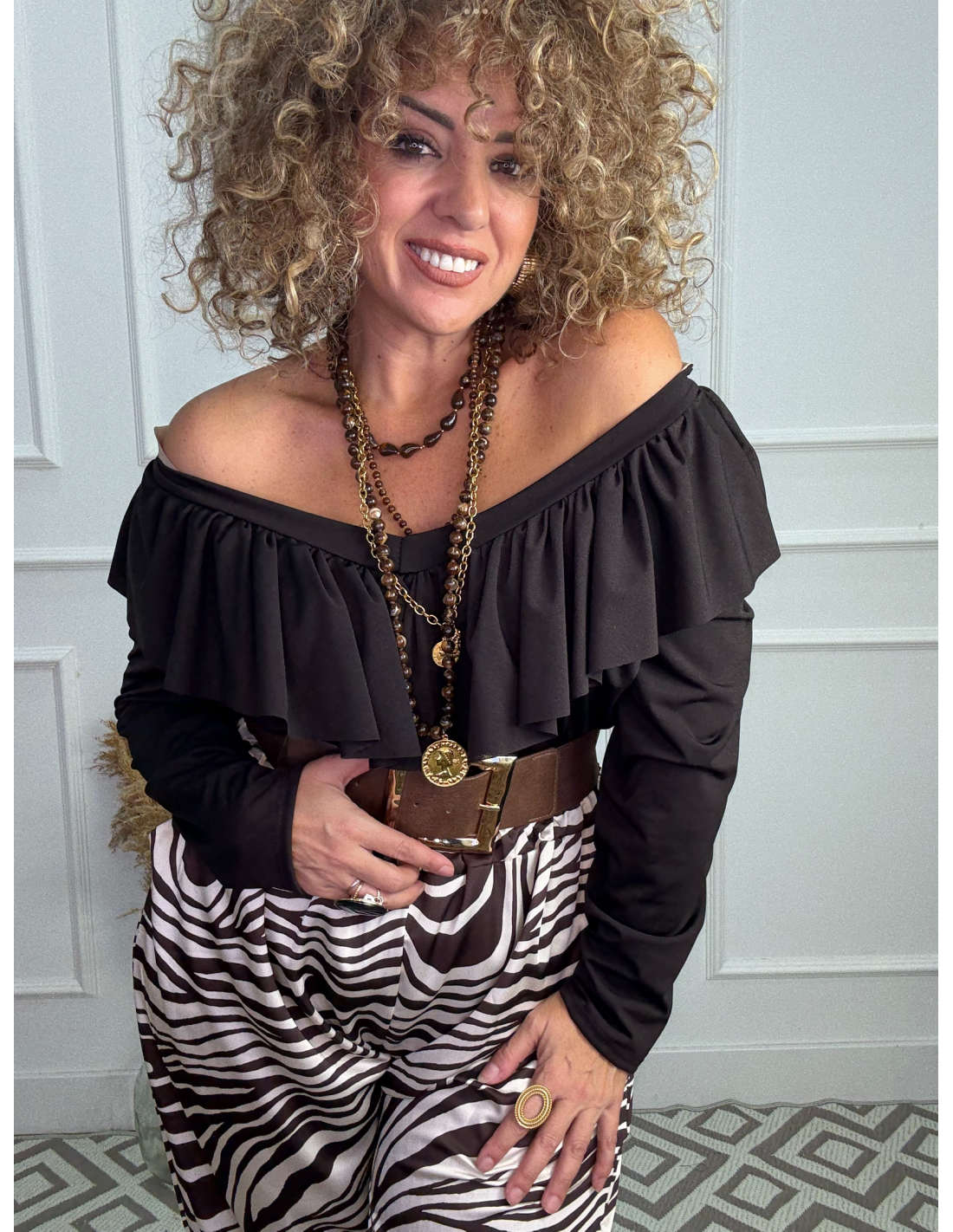 Este body de manga larga tiene un diseño elegante y femenino. Cuenta con un escote amplio en forma de barco adornado con un volante ancho que recorre todo el contorno del escote, aportando un estilo romántico y con movimiento.