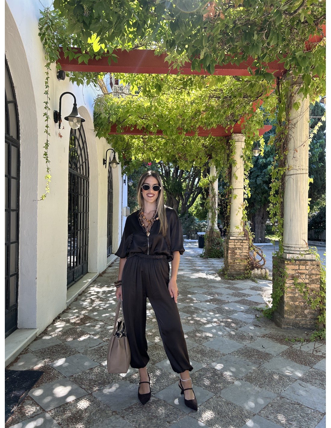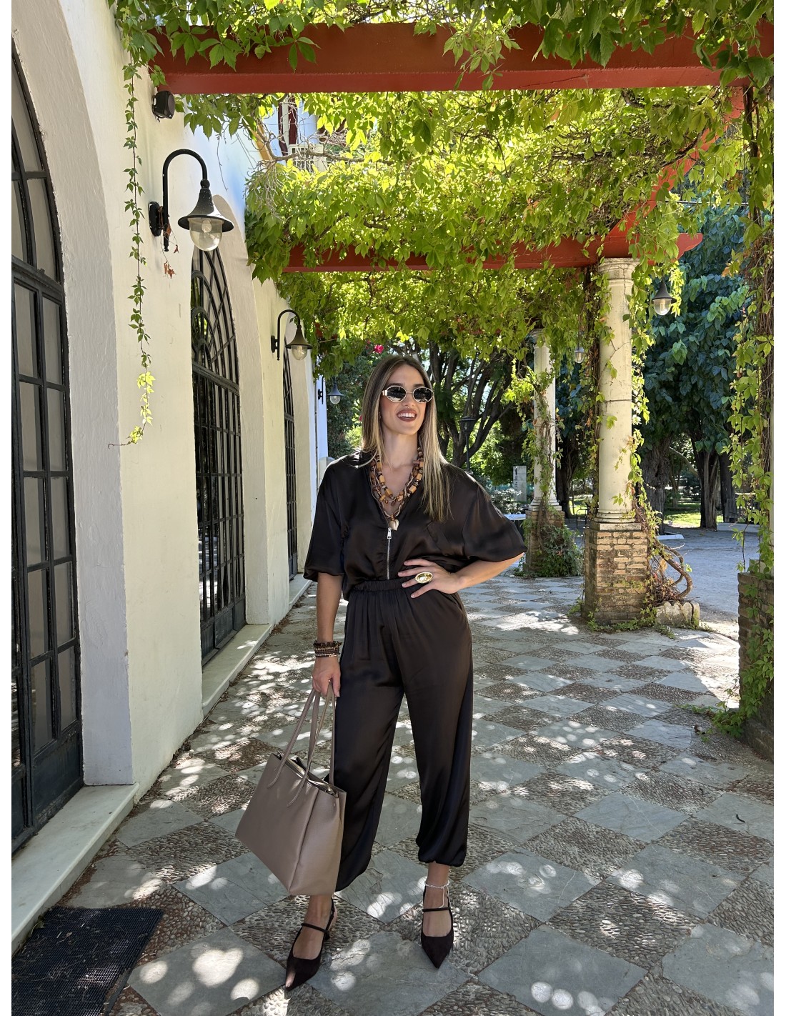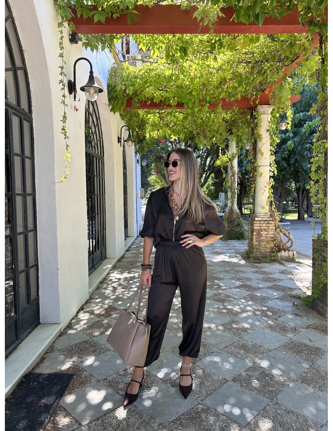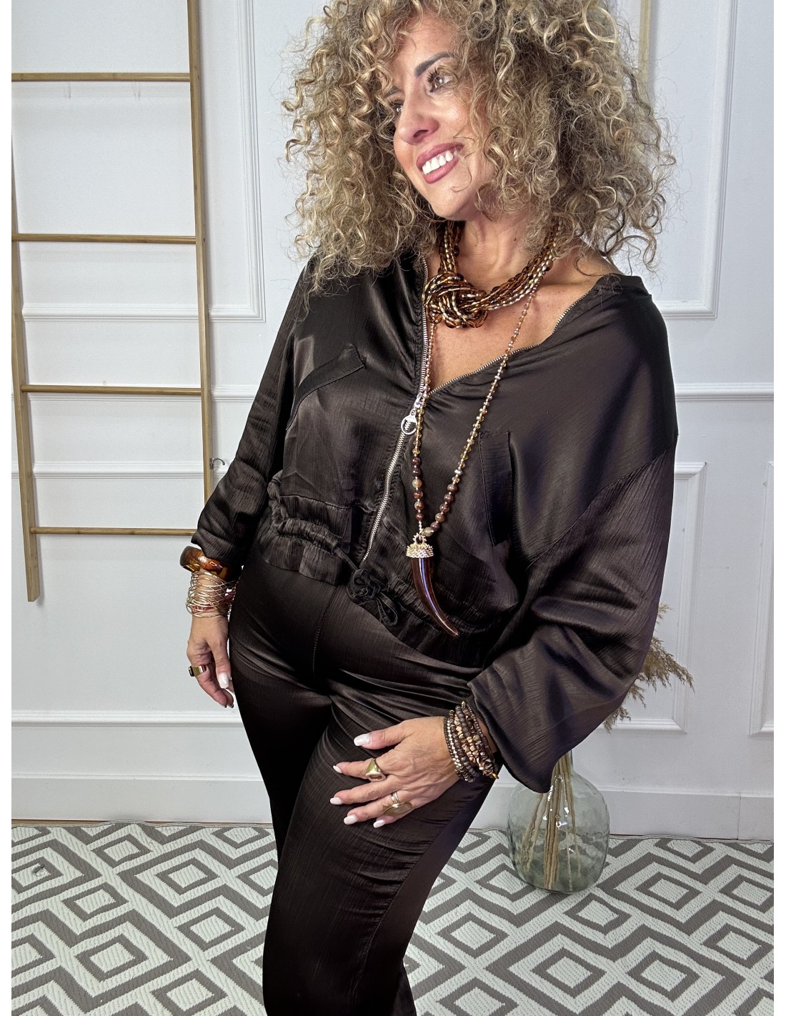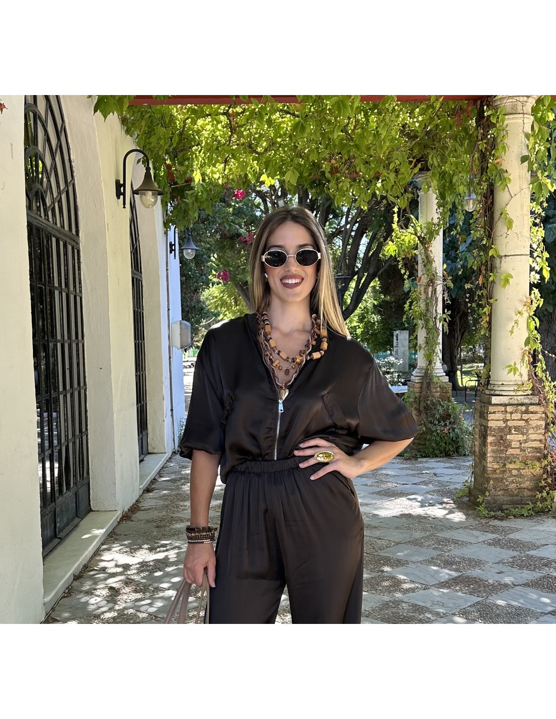 Es una chaqueta tipo bomber de tela ligera y efecto satinado-arrugado. Tiene cremallera frontal con tirador metálico circular, puños elásticos, bolsillos con solapa y cordones ajustable en la parte baja. Estilo casual y moderno, ideal para entretiempo.