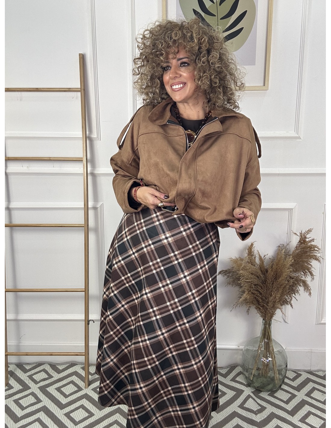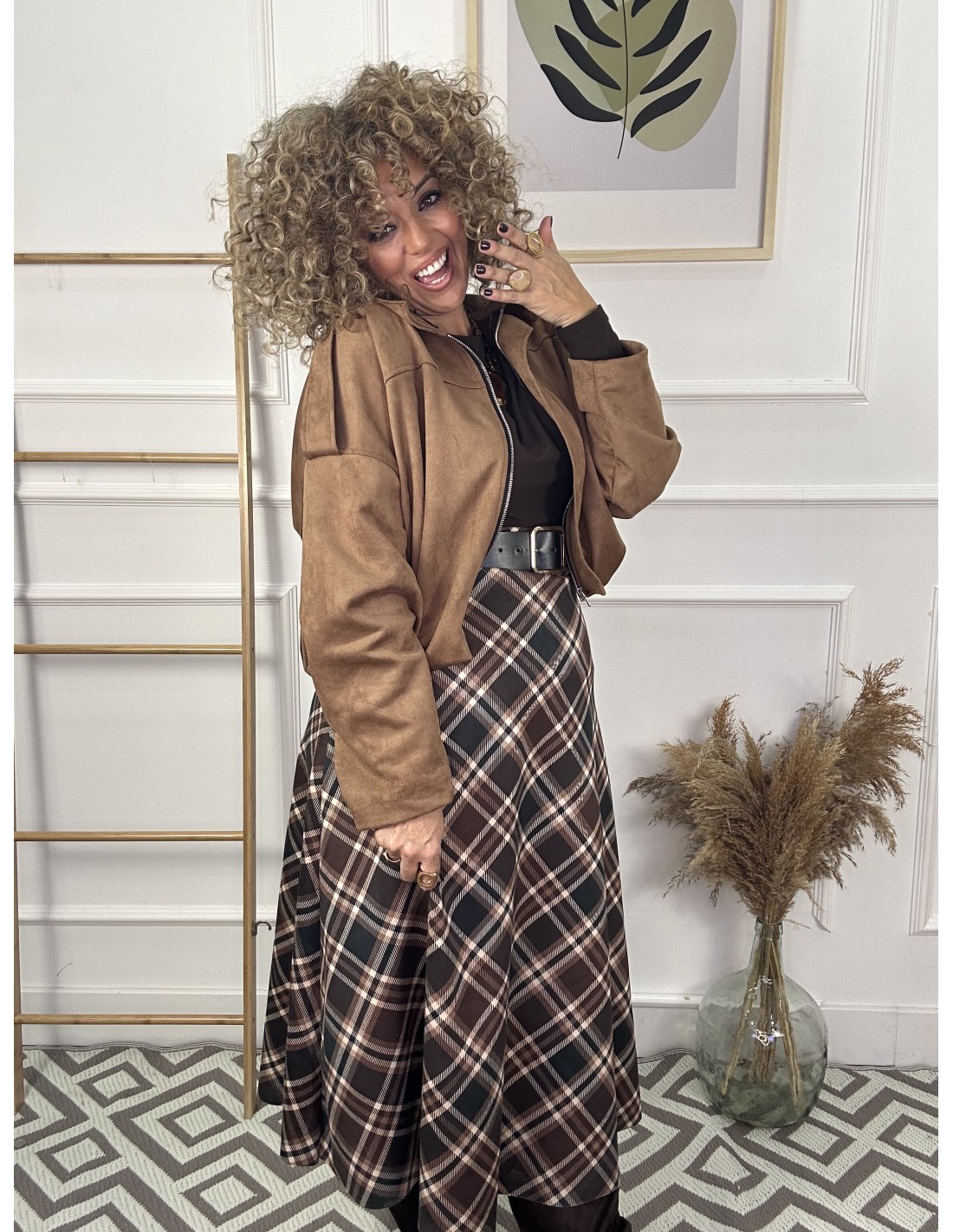 Esta prenda es una bomber jacket .Tiene cremallera frontal, cuello camisero clásico y un diseño ligeramente oversize con hombros caídos, lo que le da un estilo casual y moderno.Es una pieza versátil para looks urbanos o informales.
