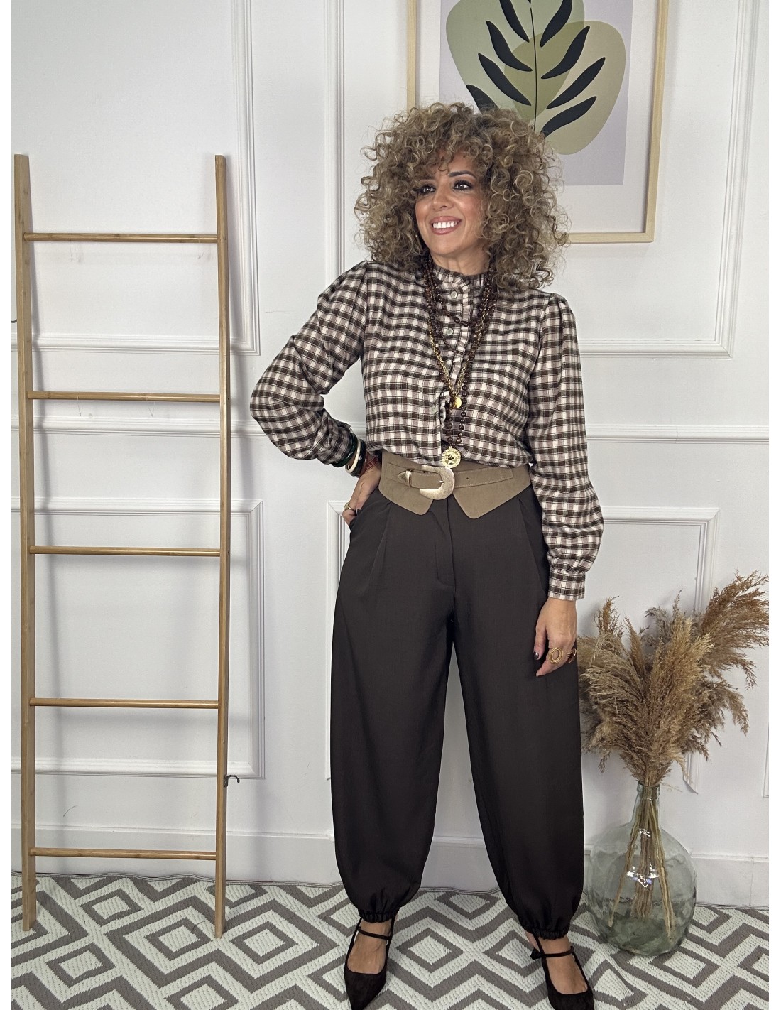 Es una camisa de cuadros con un diseño clásico y femenino. Tiene un cuello fruncido tipo mao y un cierre frontal con botones nacarados dispuestos ligeramente en diagonal. El estampado es de cuadro pequeño en tonos marrones y beige, lo que le da un aire cálido y otoñal.