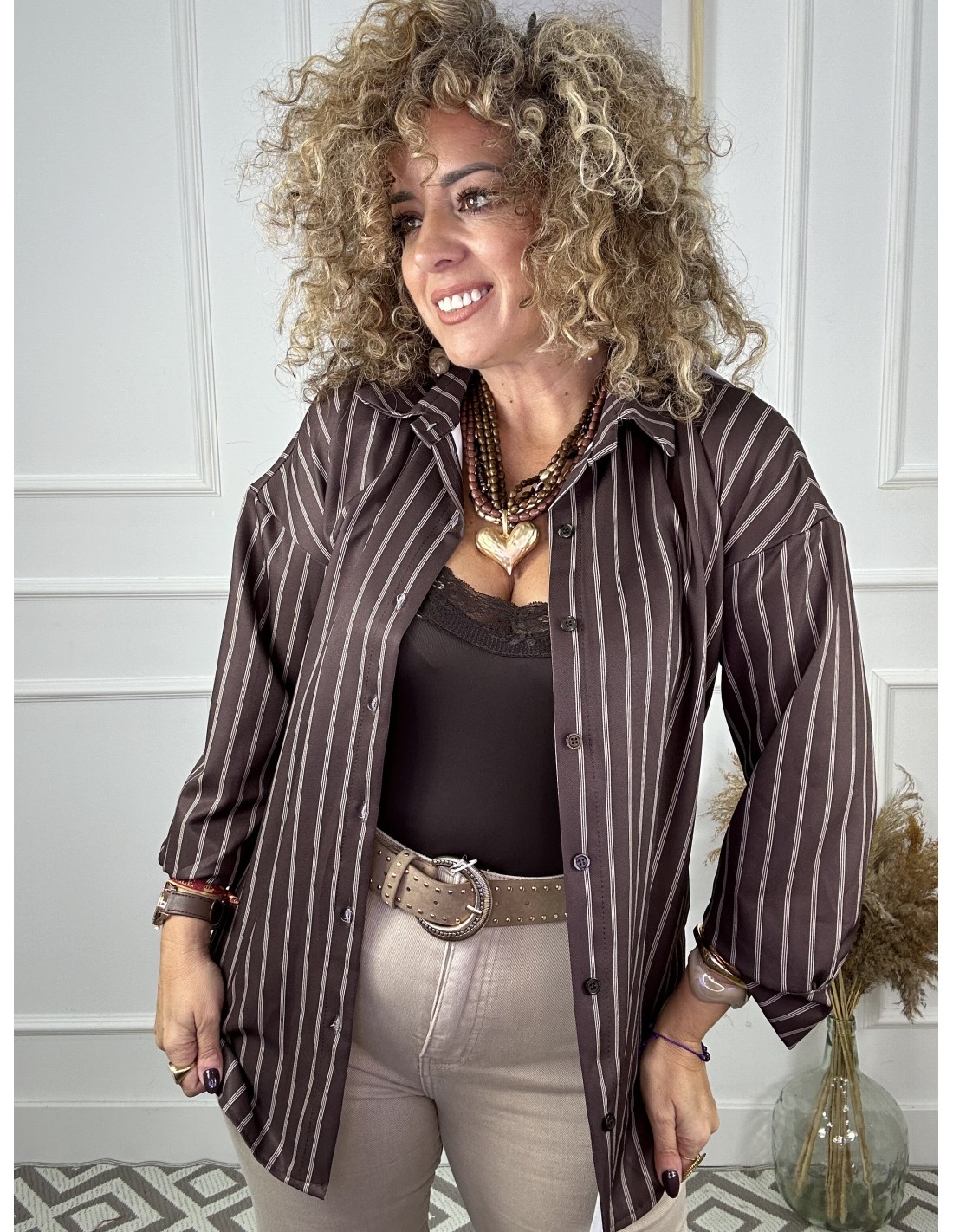 La camisa es de manga larga y tiene un diseño de rayas verticales en tonos marrón oscuro y beige. Está confeccionada con un tejido ligero y fluido, de apariencia suave. Presenta un cuello clásico y cierre frontal con botones del mismo color oscuro que el fondo de la prenda.