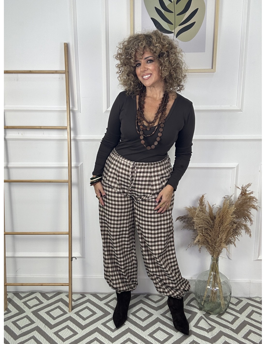 La camiseta es de manga larga y tiene un diseño sencillo, con un escote en “V” pronunciado que le da un toque femenino y estilizado.