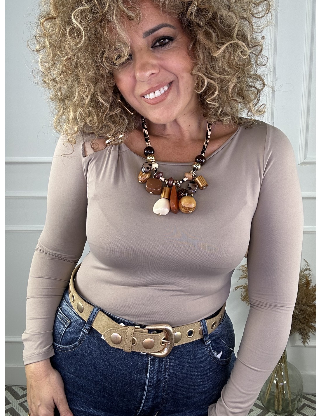- Detalle: Aro metálico dorado en el hombro izquierdo que une el fruncido del tejido, aportando un toque elegante