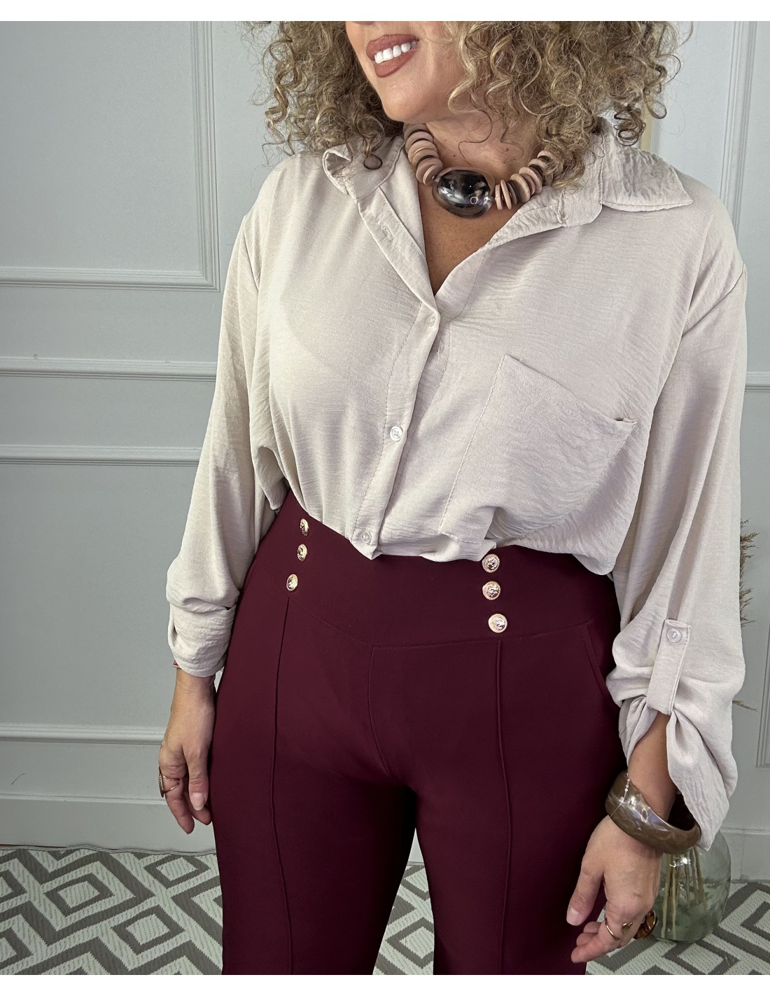 Leggings de vestir entallado de tiro alto. Está confeccionado en una tela gruesa y estructurada de color burdeos. Tiene un diseño elegante con seis botones dorados decorativos en la parte frontal, estilo marinero. El corte es recto y ajustado, ideal para un look formal o de oficina con un toque sofisticado.