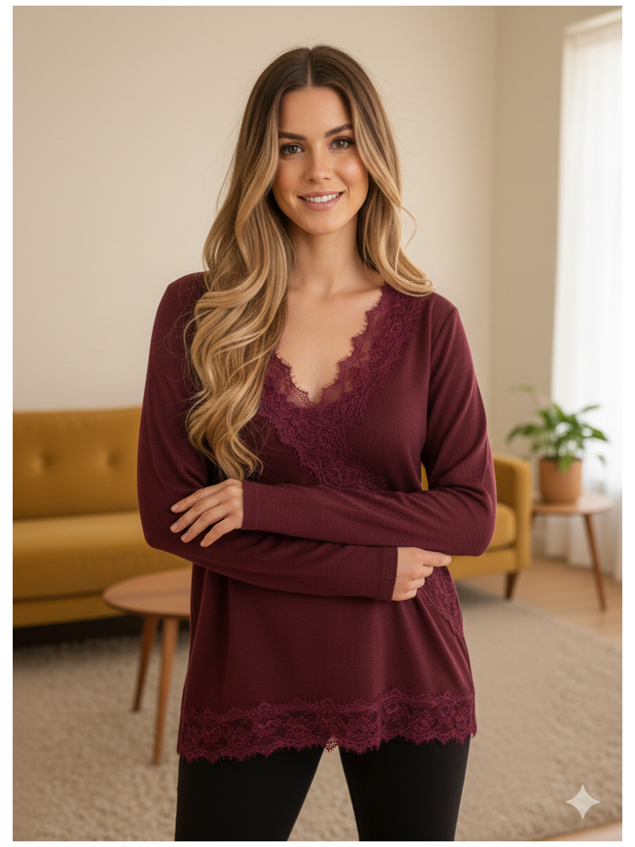 La blusa está confeccionada en un tejido suave y ligeramente elástico. Presenta un diseño elegante y femenino con detalles de encaje del mismo tono.
