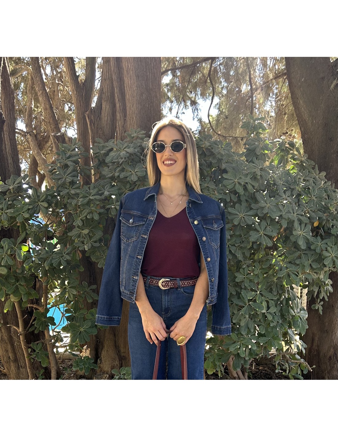 Chaqueta vaquera de mangas largas abotonado por toda la parte delantera y con bolsillos a ambos laterales en el pecho. Los botones de estas son en color plata.