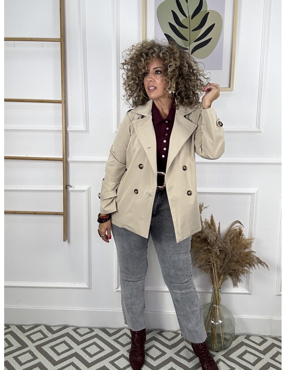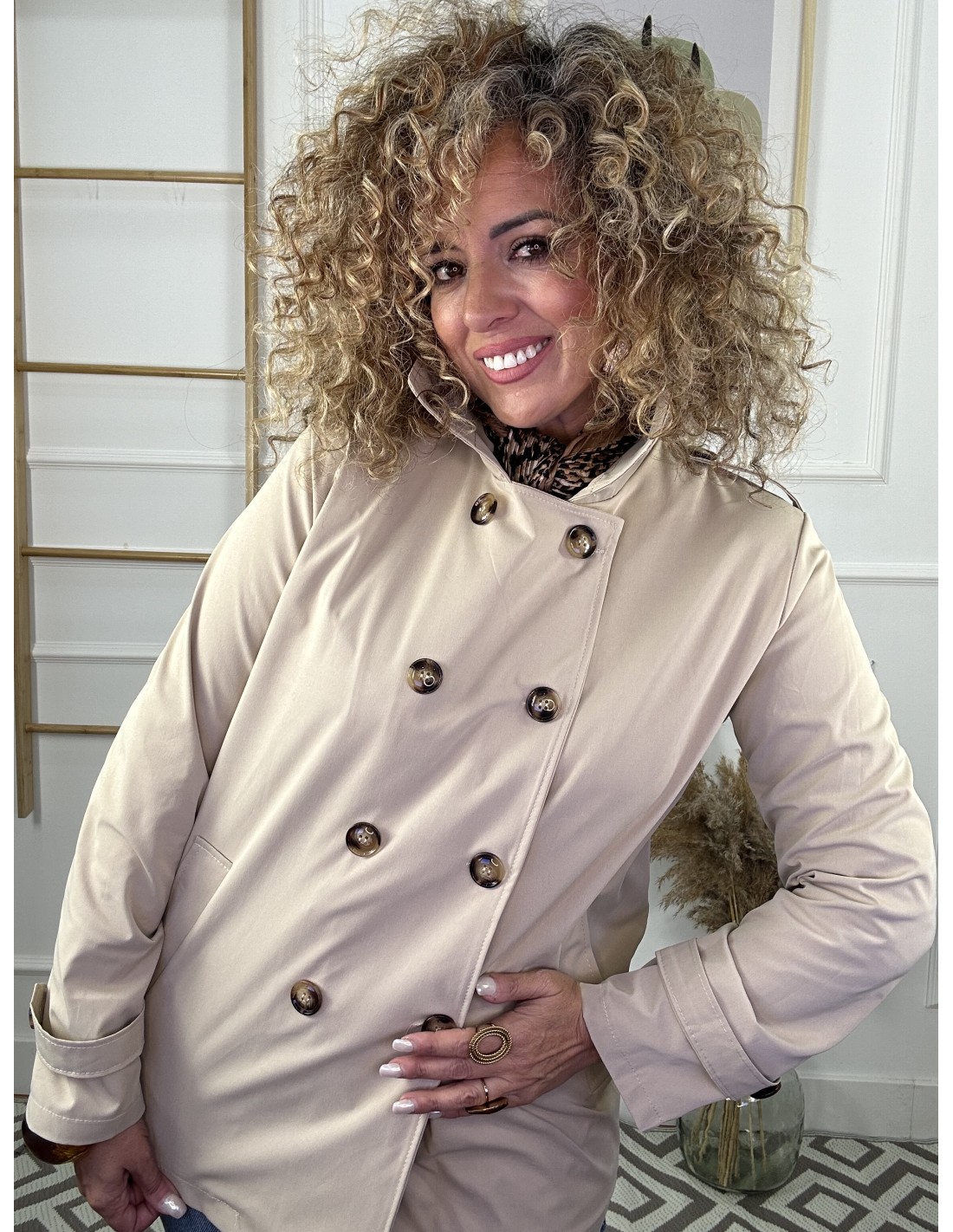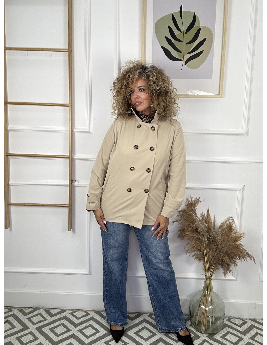 Gabardina clásica en tono beige claro, con diseño estructurado de doble abotonadura al frente. Los botones son grandes, de estilo carey, que aportan un toque elegante y atemporal. Cuenta con solapas anchas, bolsillo con tapeta y un acabado pulido, ideal para entretiempo o looks urbanos sofisticados. Una prenda versátil que combina con todo, perfecta para elevar cualquier outfit de otoño.