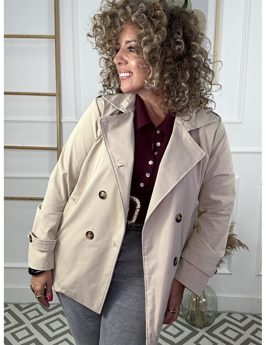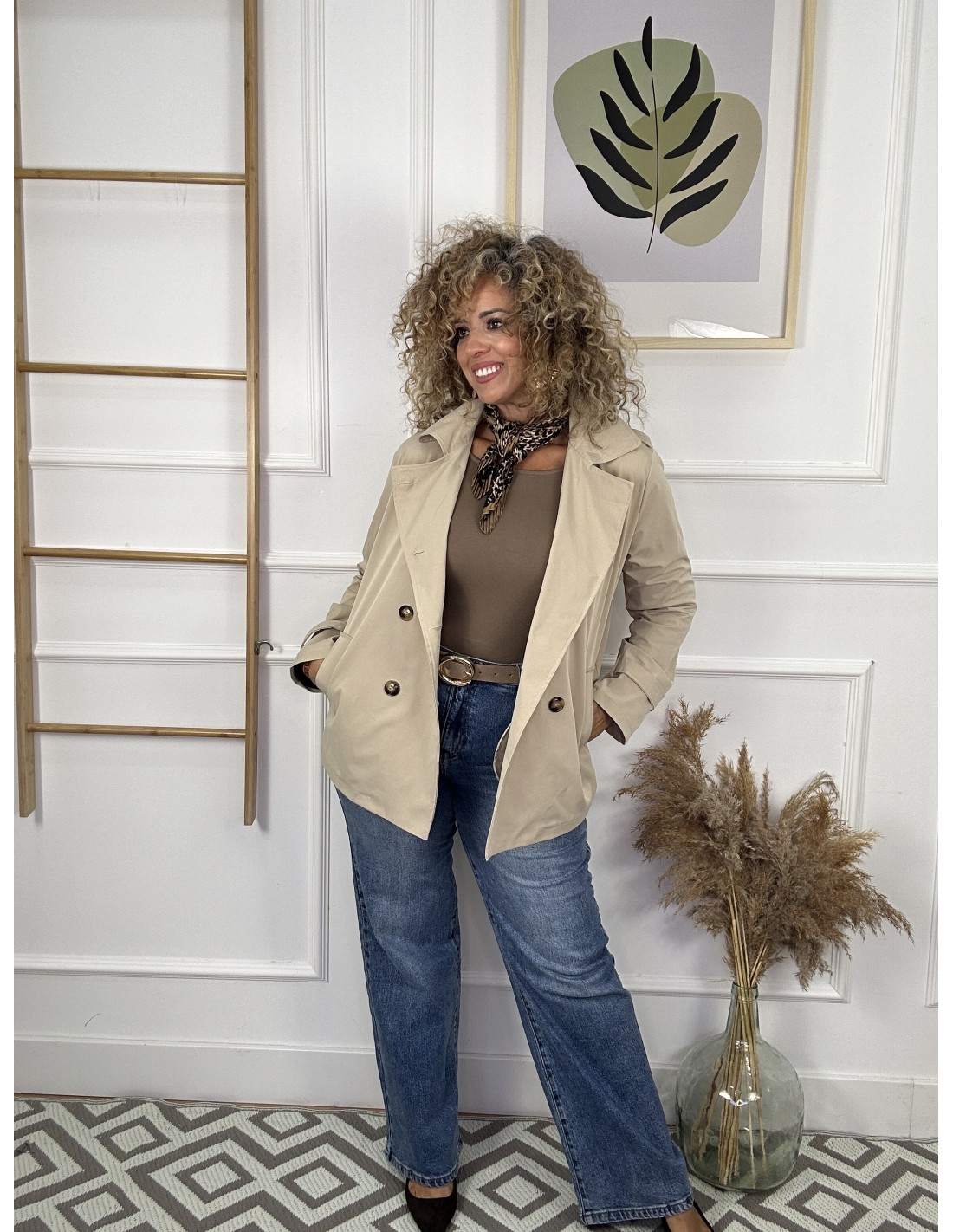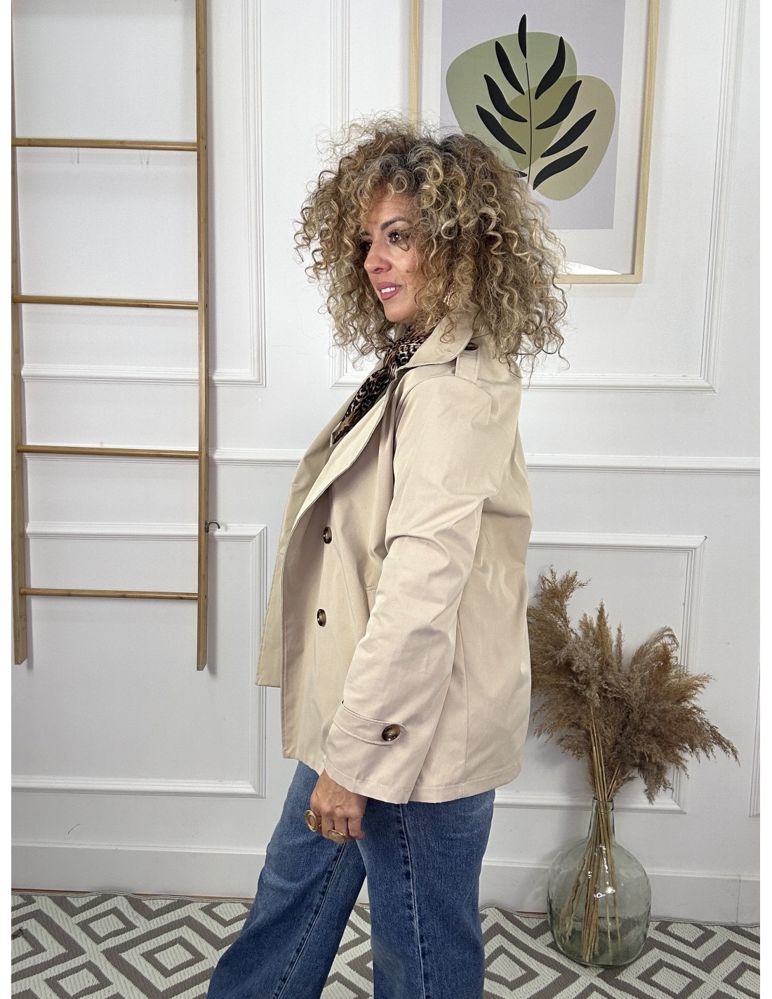 Gabardina clásica en tono beige claro, con diseño estructurado de doble abotonadura al frente. Los botones son grandes, de estilo carey, que aportan un toque elegante y atemporal. Cuenta con solapas anchas, bolsillo con tapeta y un acabado pulido, ideal para entretiempo o looks urbanos sofisticados. Una prenda versátil que combina con todo, perfecta para elevar cualquier outfit de otoño.