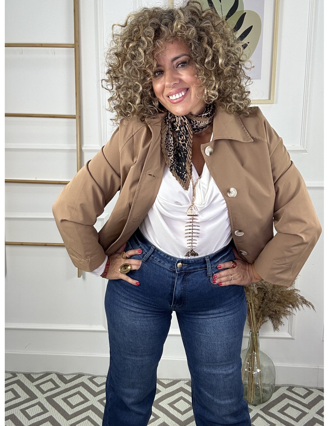 Es una prenda atemporal, versátil y ligera, ideal para looks formales o casuales en entretiempo.