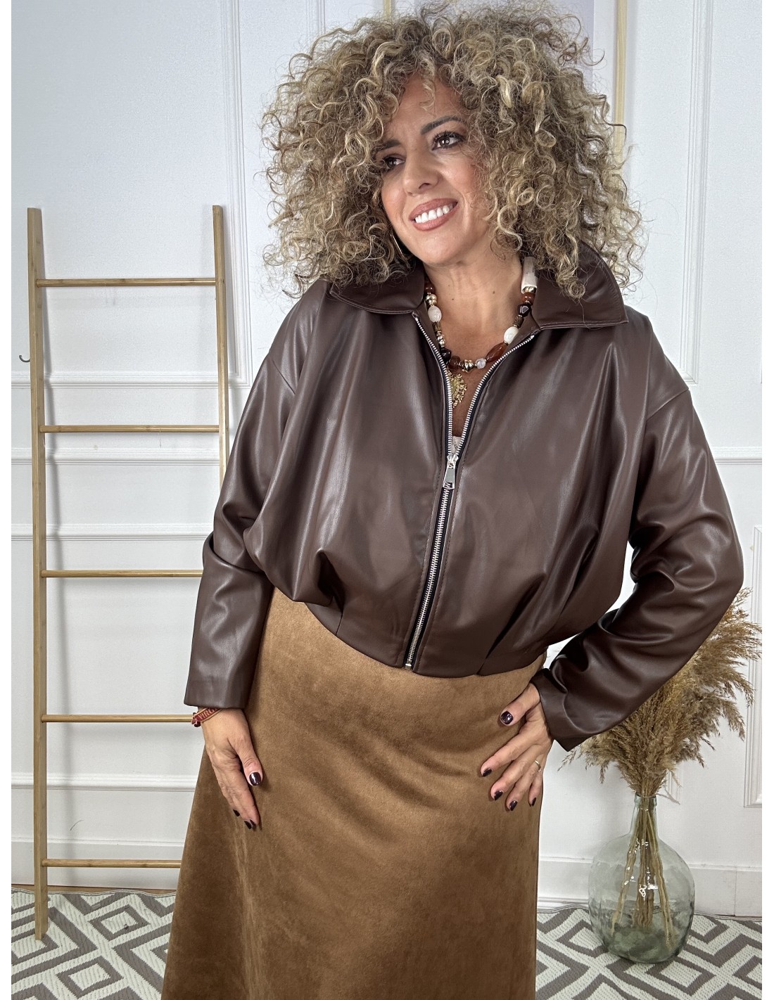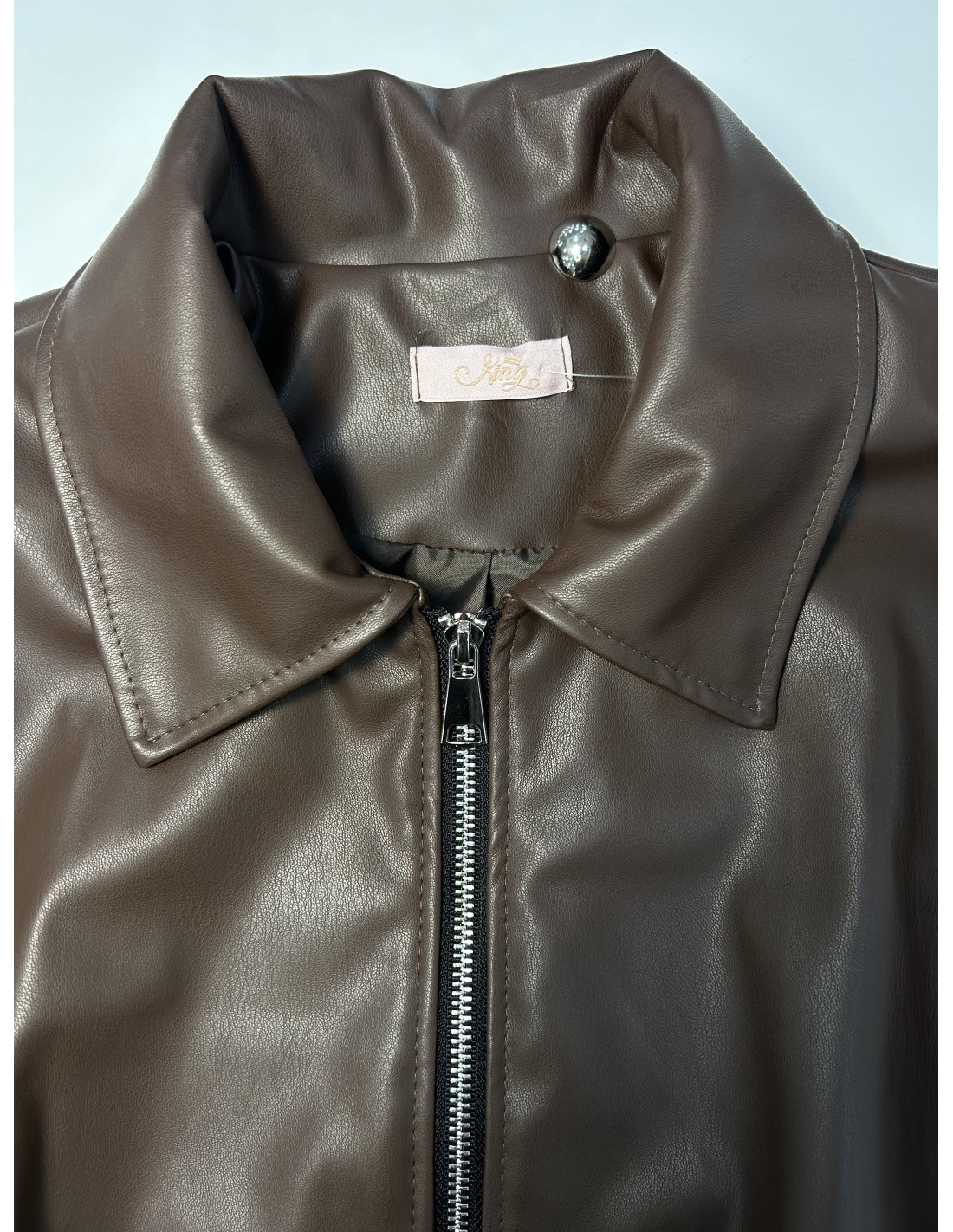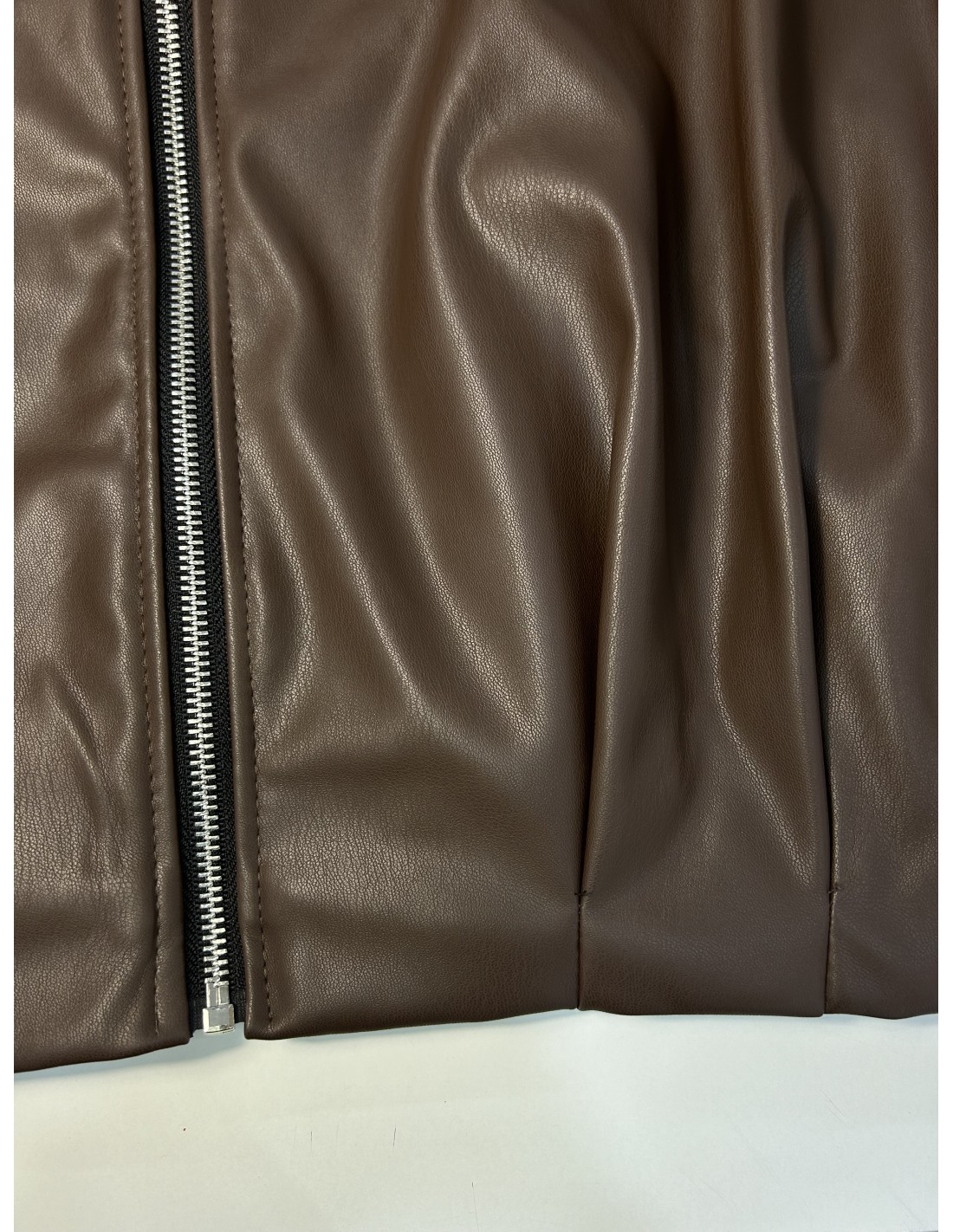 La chaqueta es de color marrón oscuro, con un diseño moderno y minimalista. Está confeccionada en un material que imita la piel o el cuero sintético, de acabado liso y ligeramente brillante, lo que le da un aire elegante y contemporáneo.