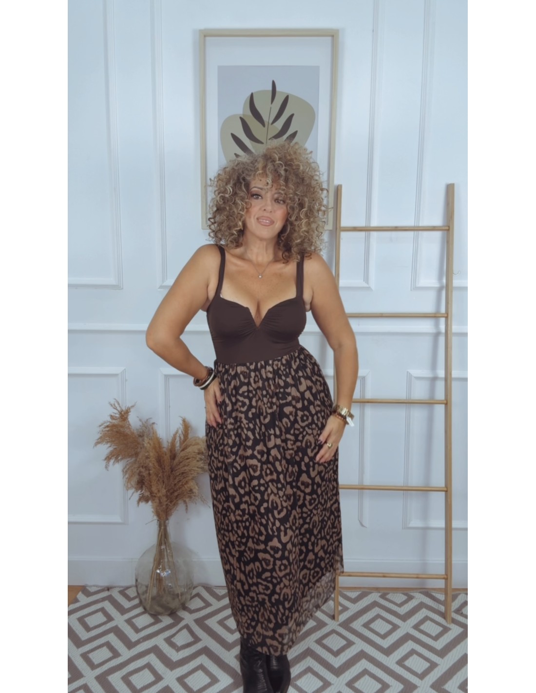 La falda es de largo midi y presenta un estampado de leopardo en tonos beige y negro. El tejido parece ligero y con caída, posiblemente de gasa o un material similar, con una capa interior que le da opacidad. Tiene una cintura elástica y un diseño con ligero vuelo, lo que le aporta movimiento. Es una prenda llamativa y versátil, ideal para combinar tanto con prendas básicas como con otras más elegantes.
