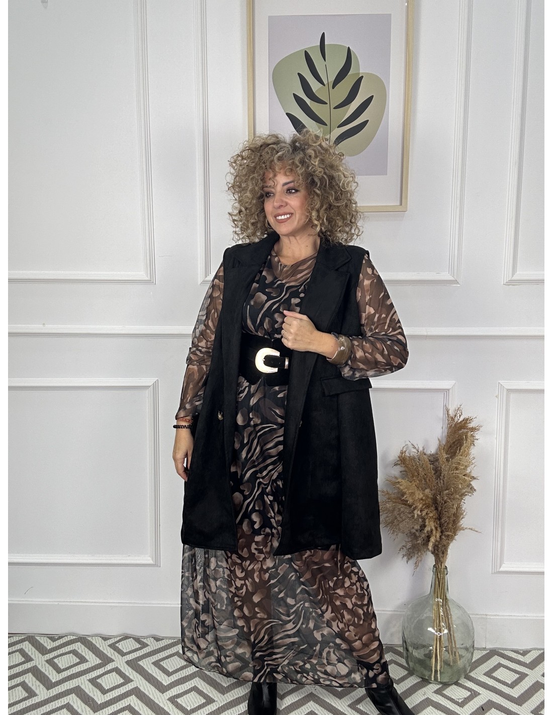 El chaleco tiene un diseño largo y estructurado, con un estilo elegante y moderno. Está confeccionado en una tela con textura suave, posiblemente tipo ante o gamuza sintética, lo que le da un acabado sofisticado.