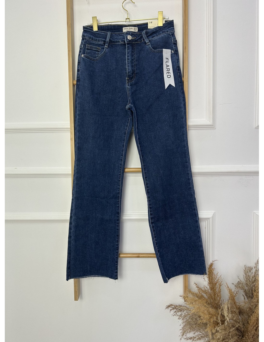 Este es un pantalón de mezclilla en tono azul oscuro con un diseño clásico de cinco bolsillos. Tiene cintura alta con cierre de botón metálico y cremallera. La etiqueta indica que es un modelo *"flared"*, lo que significa que el corte es ajustado en la parte superior y se ensancha desde la rodilla hacia abajo, tipo campana. Es un estilo retro muy popular que estiliza la figura y alarga visualmente las piernas. Ideal para combinar con blusas ajustadas o tops cortos.