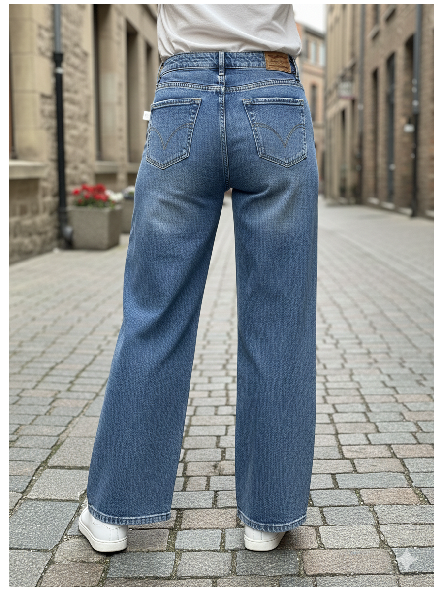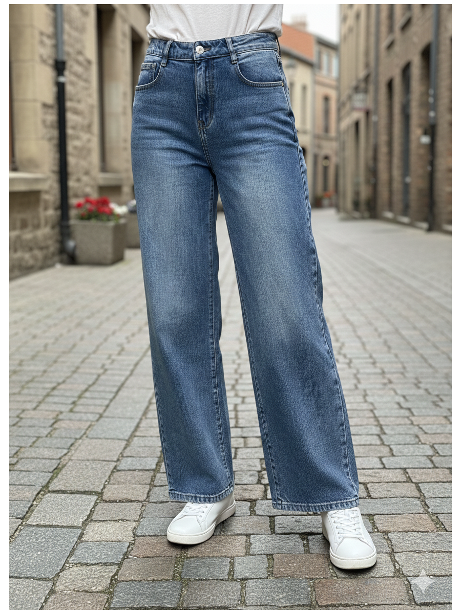 Pantalón vaquero de tiro alto en mezclilla azul índigo con leve efecto desgastado.