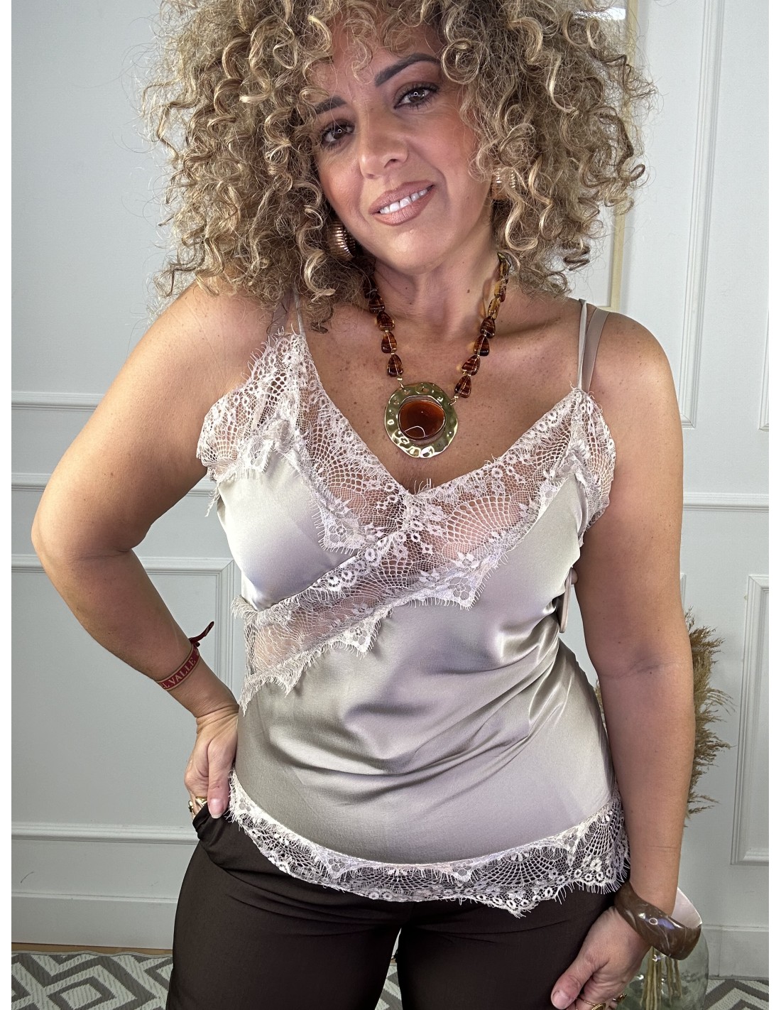 Lencera de color marrón oscuro, beige y negro, con un estilo elegante y delicado. Está confeccionada en un tejido satinado que tiene un ligero brillo, típico de las prendas tipo camisón o top lencero.