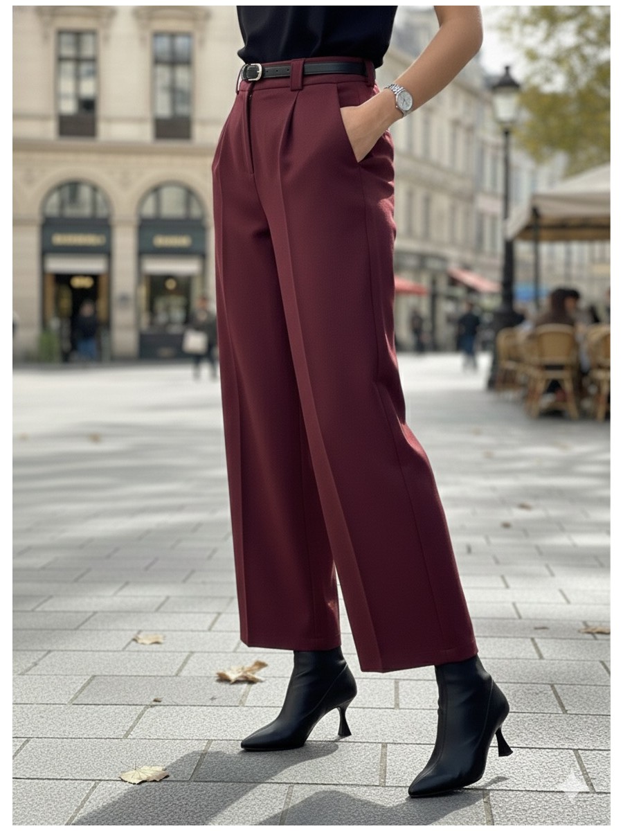 El pantalón es de corte recto, confeccionado en una tela con caída suave, ideal para un look formal o casual elegante. Tiene pretina con pinzas, presilla para cinturón y viene acompañado de un cinturón negro delgado con hebilla metálica plateada. La cintura es semi-elástica en la parte trasera, lo que proporciona mayor comodidad y ajuste. El diseño incluye pliegues marcados al frente, lo que estiliza la pierna y le da un toque sofisticado.