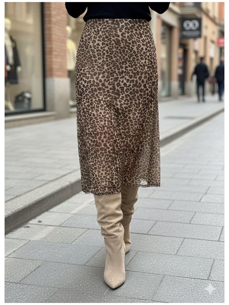 Falda con estampado de leopardo. Es una prenda de corte recto y largo, características del estampado animal print. El tejido parece ligero y semitransparente, posiblemente con una capa interior. En la parte superior. Por la parte de abajo lleva un forro inferior ya que la falda es translúcida, que da un toque sutil.