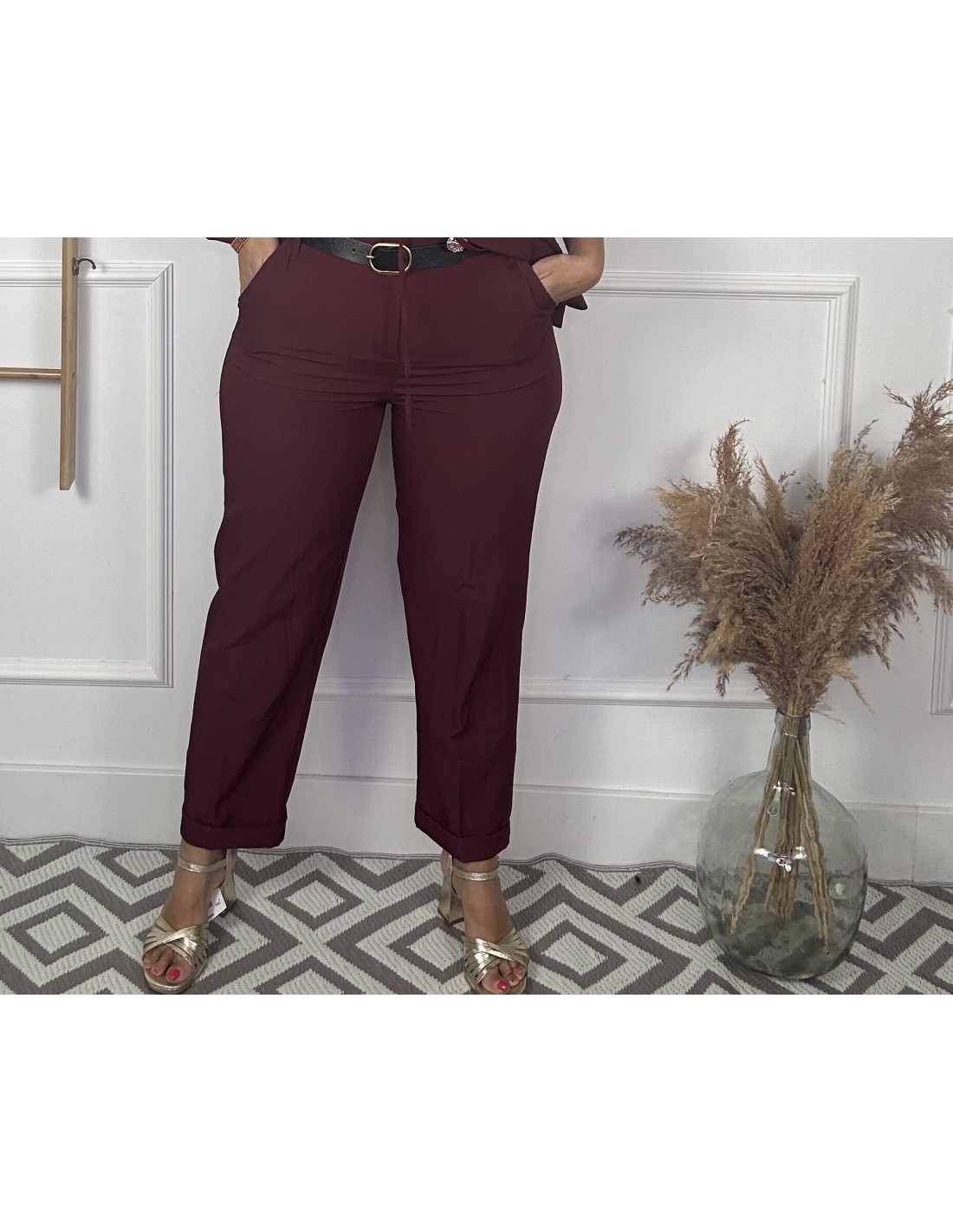 Incluye un cinturón negro con hebilla dorada, que resalta sobre el tono del pantalón y añade contraste elegante. El corte sugiere que es un pantalón pensado para ocasiones semi-formales o formales, aunque también puede adaptarse a looks más casuales si se combina con calzado y accesorios adecuados.