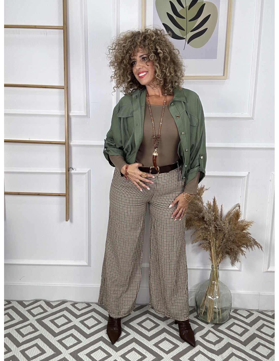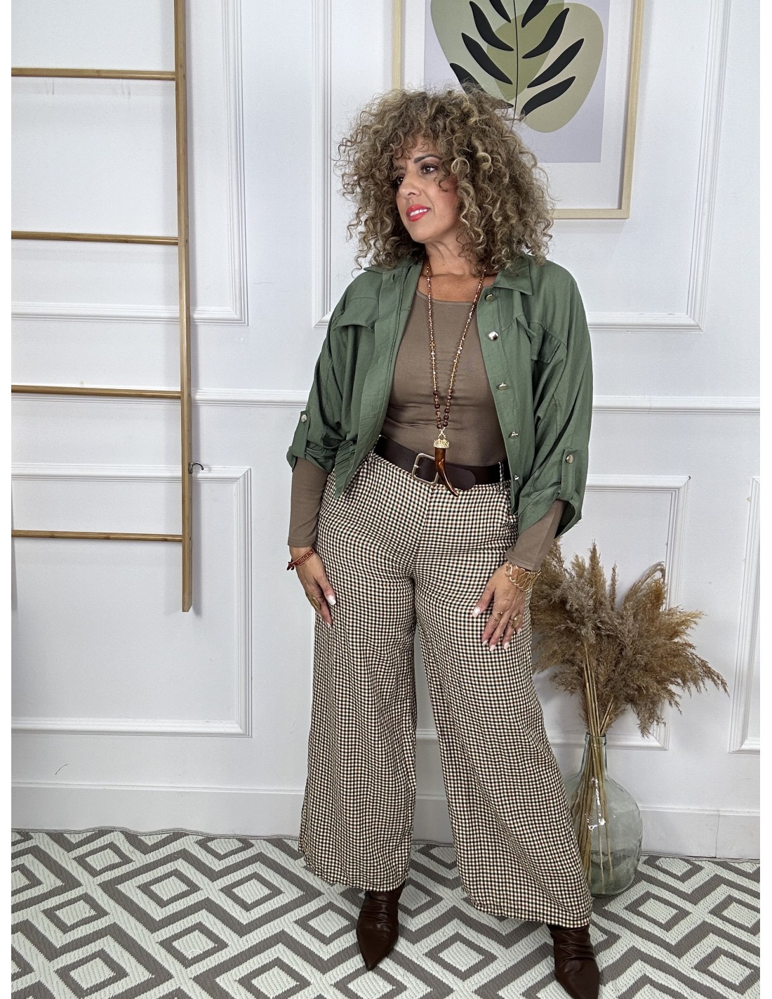 Pantalón de corte amplio y estilo casual con diseño de cuadros pequeños en tonos beige, marrón y verde oliva.