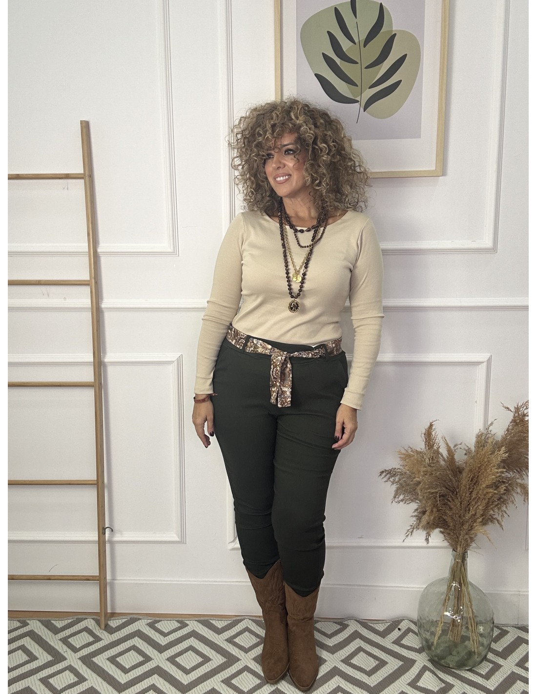 • Cinturón: de tela estampada con diseño paisley (motivos florales y arabescos en tonos beige, marrón y azul), que añade contraste y estilo.