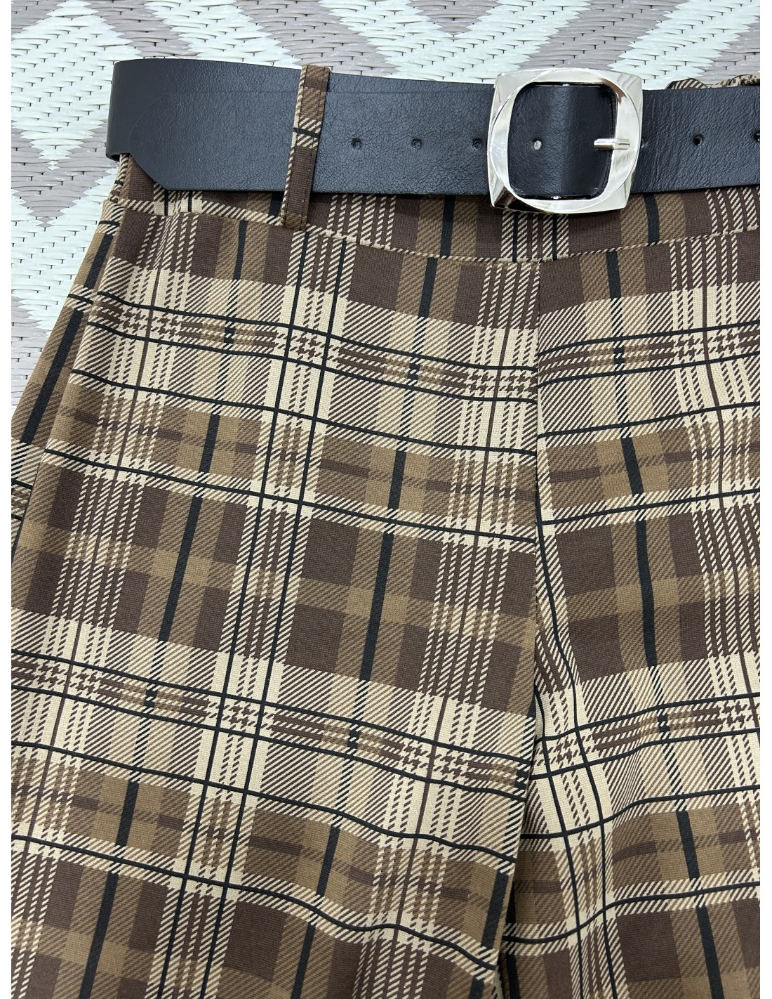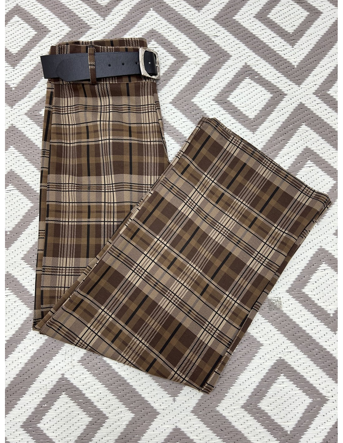 El pantalón es de cuadro escocés en tonos marrones, beige y negro, con un diseño clásico y elegante. Tiene una cintura alta que incluye un cinturón negro de imitación cuero, con una hebilla metálica dorada que aporta un toque sofisticado.