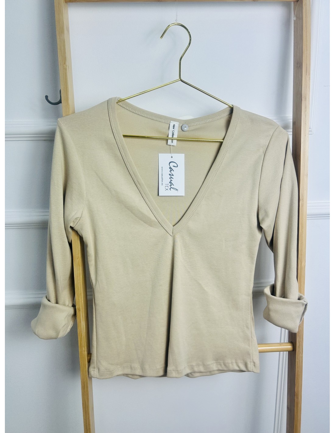 La camiseta es de manga larga y tiene un diseño sencillo, con un escote en “V” pronunciado que le da un toque femenino y estilizado.