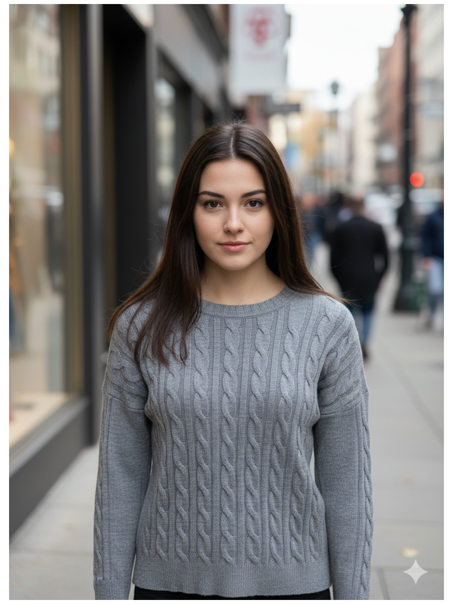 Es un jersey de punt con un diseño trenzado (cable knit) que recorre verticalmente toda la prenda, tanto en el cuerpo como en las mangas. El tejido es uniforme y de grosor medio, con un acabado suave. Presenta un cuello redondo con ribete de punto elástico, que también se encuentra en los puños y en el bajo del jersey. La prenda tiene un estilo clásico y acogedor, ideal para un look cómodo y elegante.